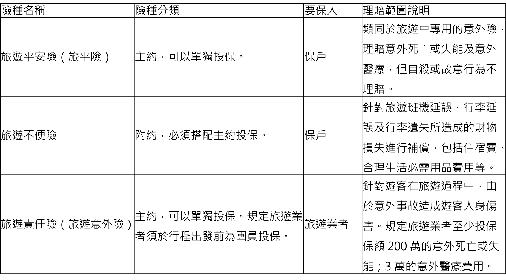 在規劃旅遊時,除了考慮費用、地點、住宿品質外,如果是出遠門(尤其是出國),建議一定要將和「旅遊」相關的保險列入預算範圍,而和旅遊相關的保險,主要有這三項: