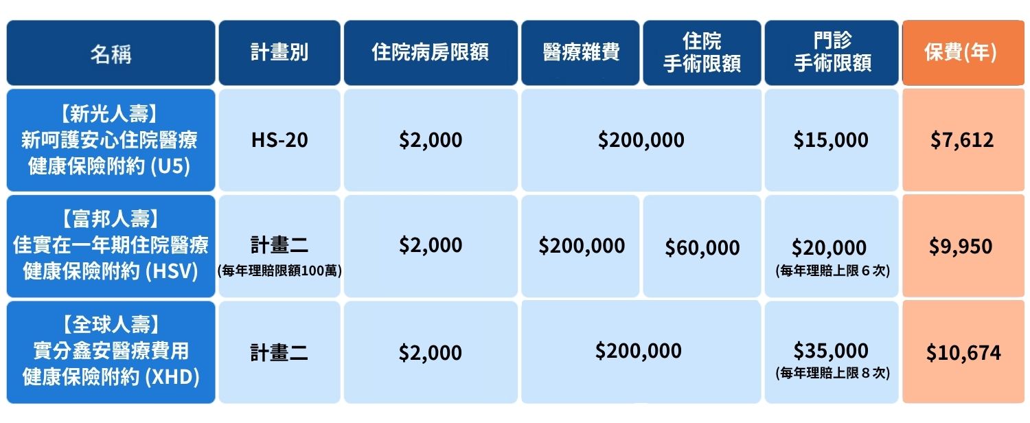 針對上述提到的三張實支實付醫療險保單做保障範圍及保費的比較,以一個 30 歲女性、標準體(無吸菸、無病史)來說,其保障分別是: