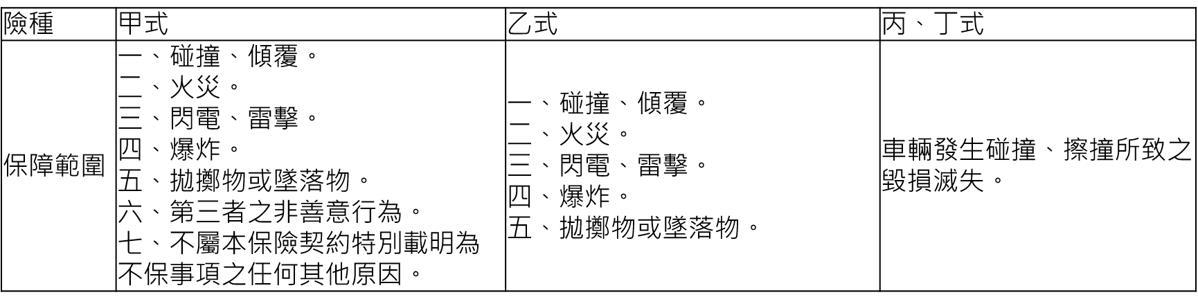 車體損失險,顧名思義,是保障「自己」的車體損失,根據承保範圍及保費,共有分成甲式、乙式、丙式、丁式四種,接下來我們將以表格的方式來呈現承保範圍的差異: