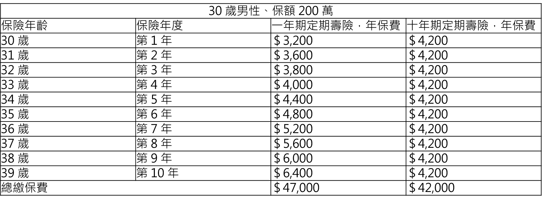 為了讓大家更了解自然保費和平準保費的差異,我們用 30 歲的男性、保額 200 萬,投保一年期壽險及投保多年期壽險的保費來對照: