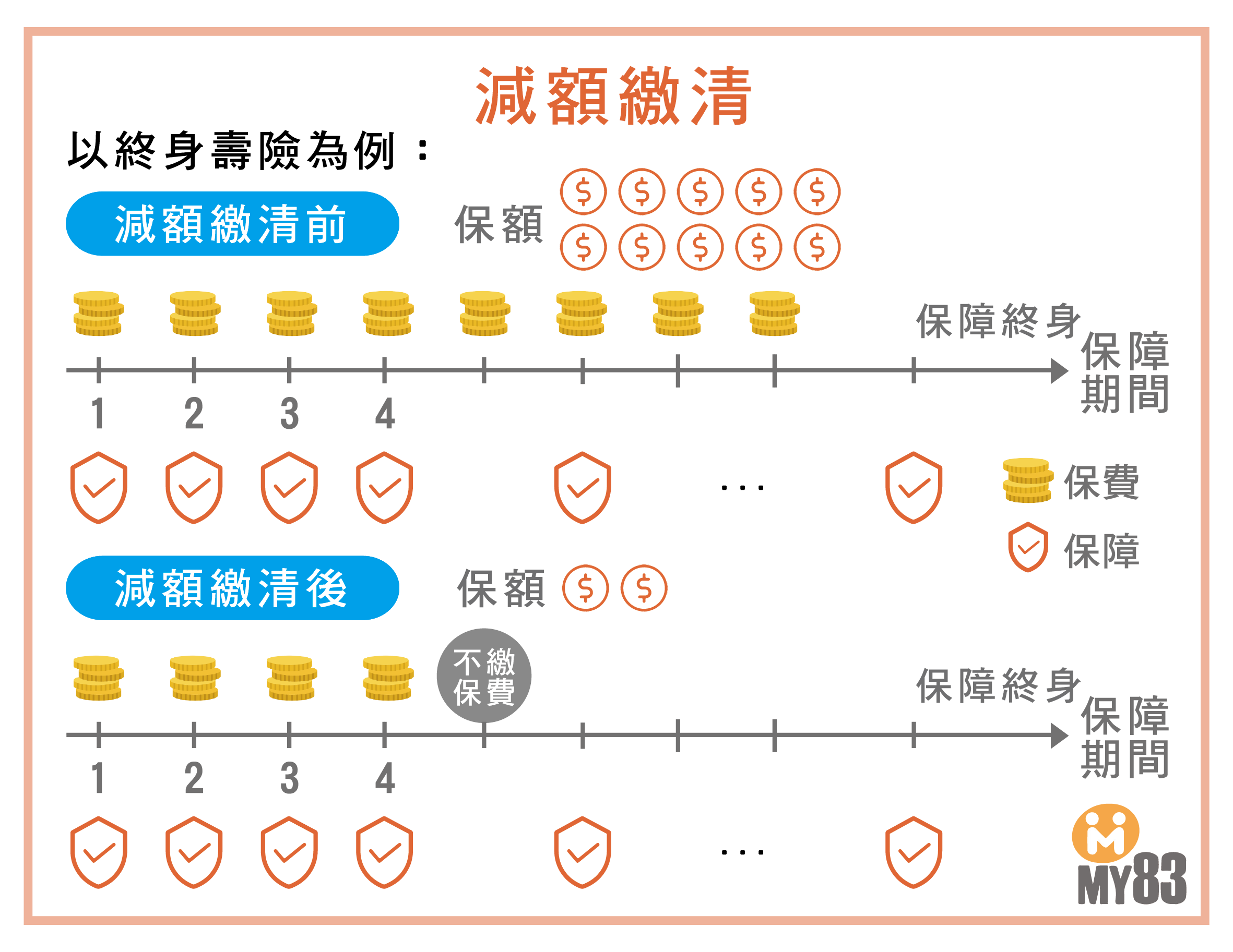 所謂「繳清」,指的是用保單價值準備金直接繳清主約的保費;而所謂「減額」,指的是因為繳清保費後,保障額度也會等比例下降,稱為減額。