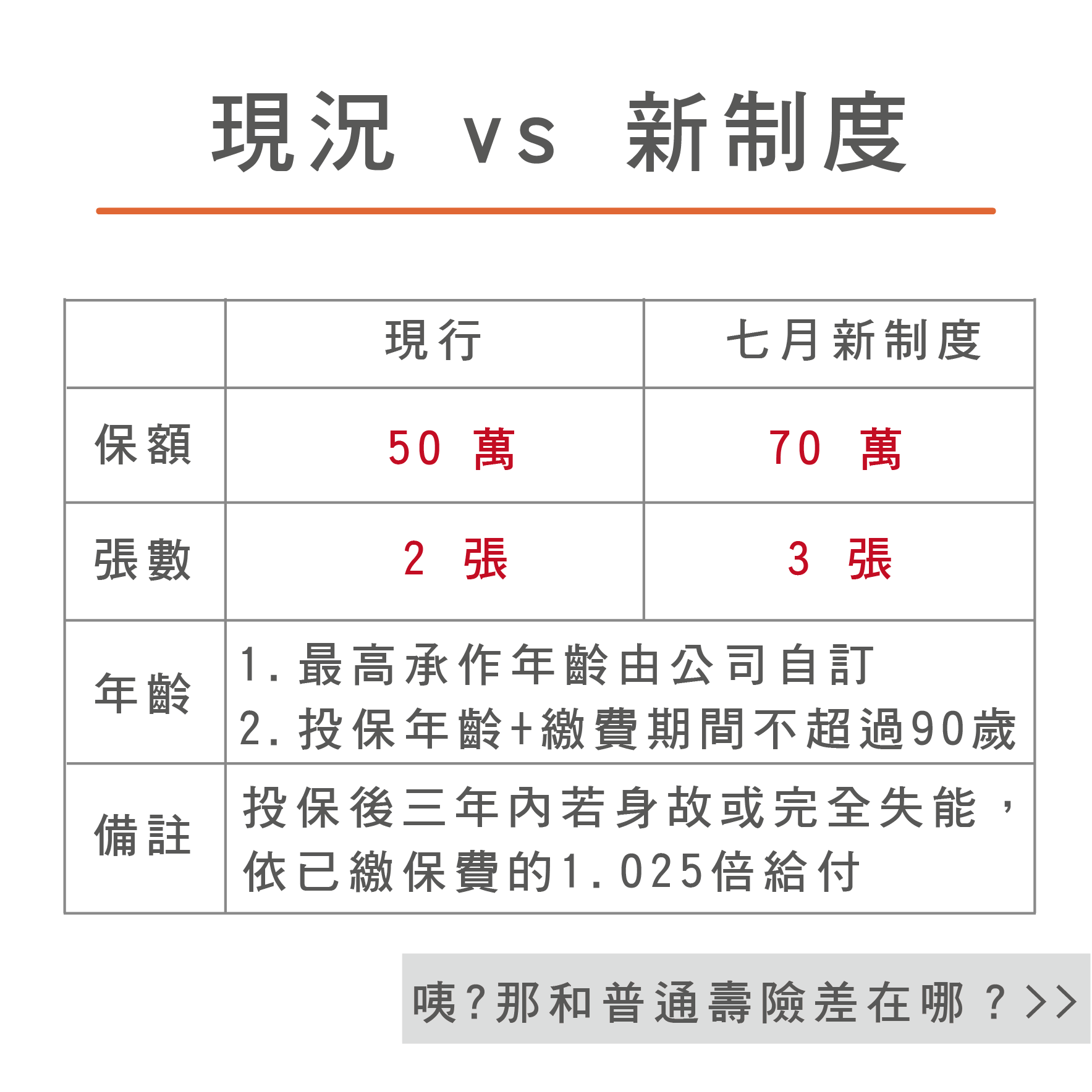 比較不同的地方是,一般保險公司常見的壽險是投保後,就立即享有和保額相同的壽險保障。而小額終老保險若在投保後的三年內身故或完全失能,是領回已繳保費的1.025倍,第四年起才會享有和保額相同的壽險保障。
