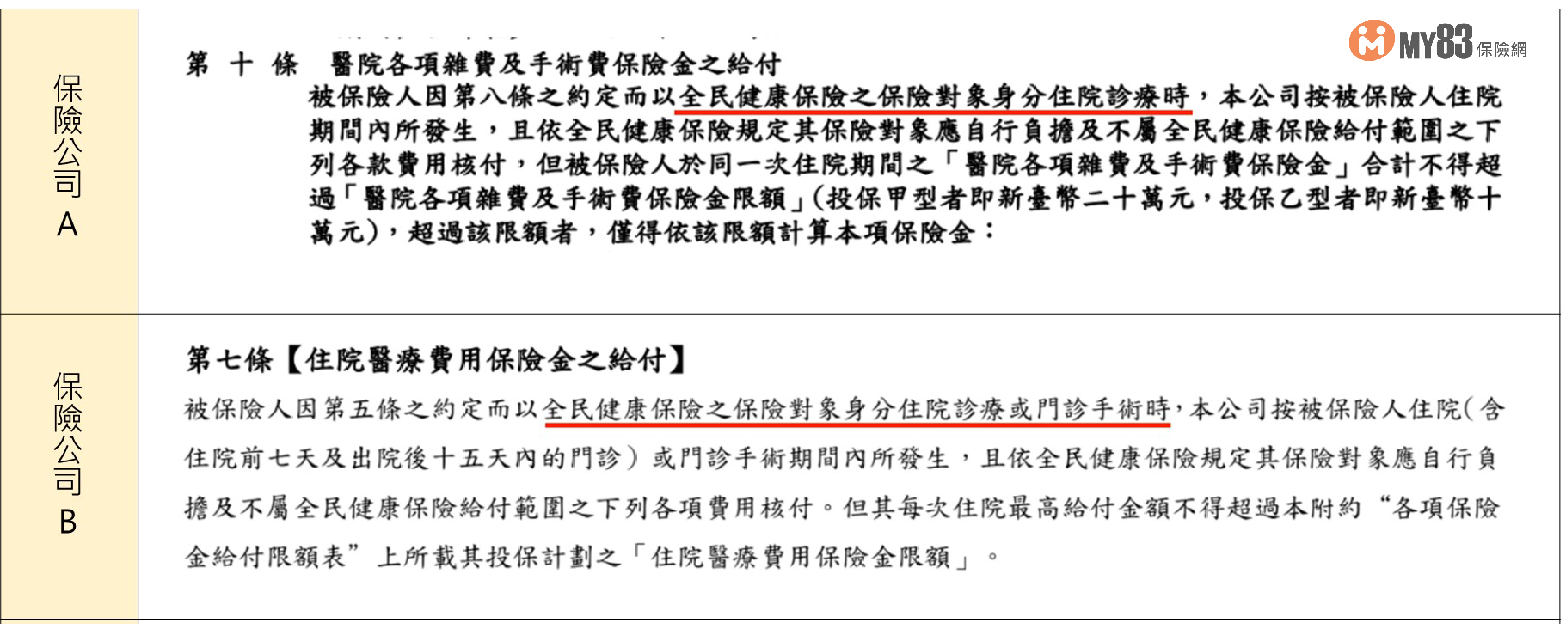 B公司:不論住院或門診(不需住院)手術都可以啟動醫療費用保險金。