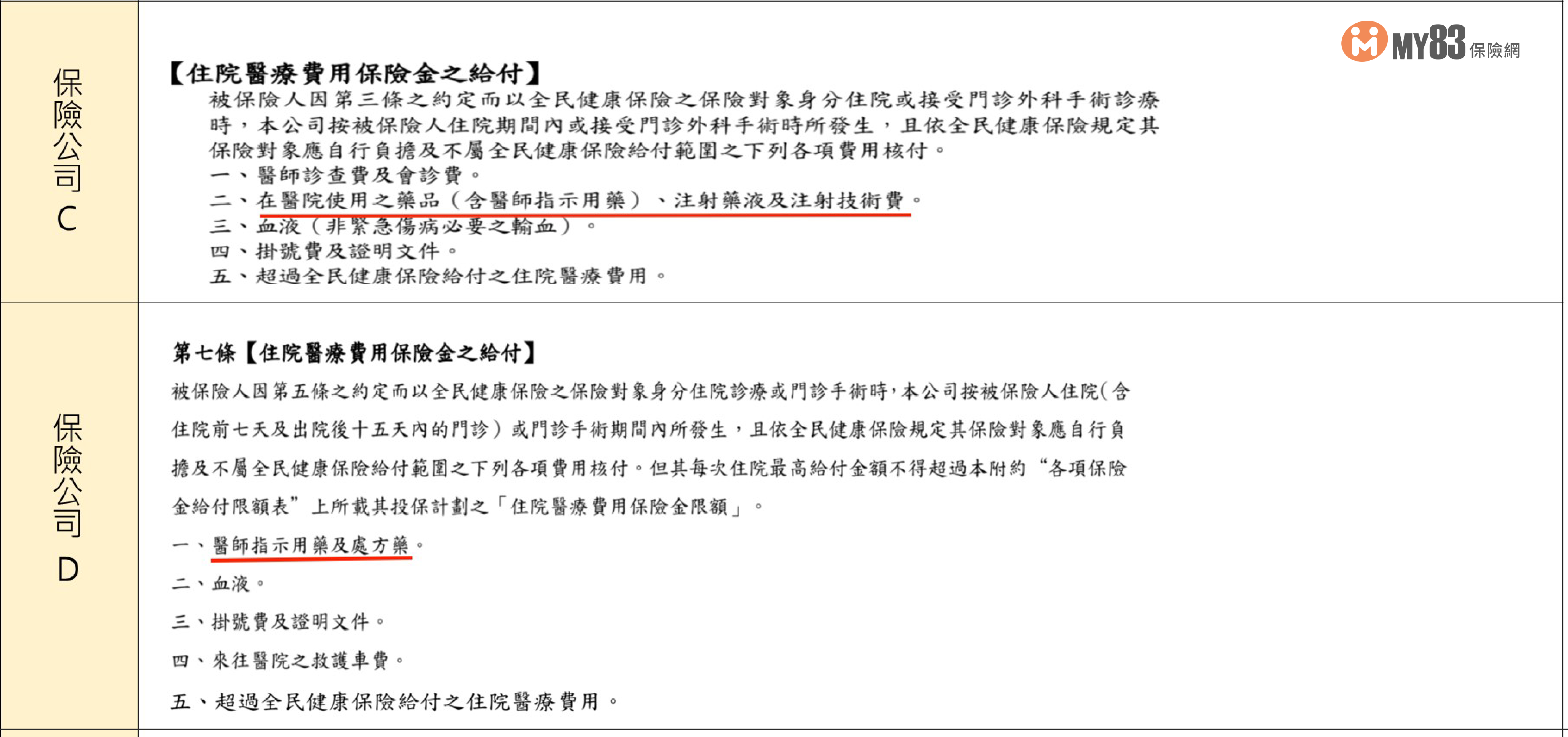 這就不像上面的案例那樣,字數越多保障就越多囉!舉例來說,現今常見癌症治療主流方式「口服藥物」,有時醫生會在住院時開完出院後30日的藥物,此時的藥費可能就會依照兩者條款的差異性,會有不同的理賠。