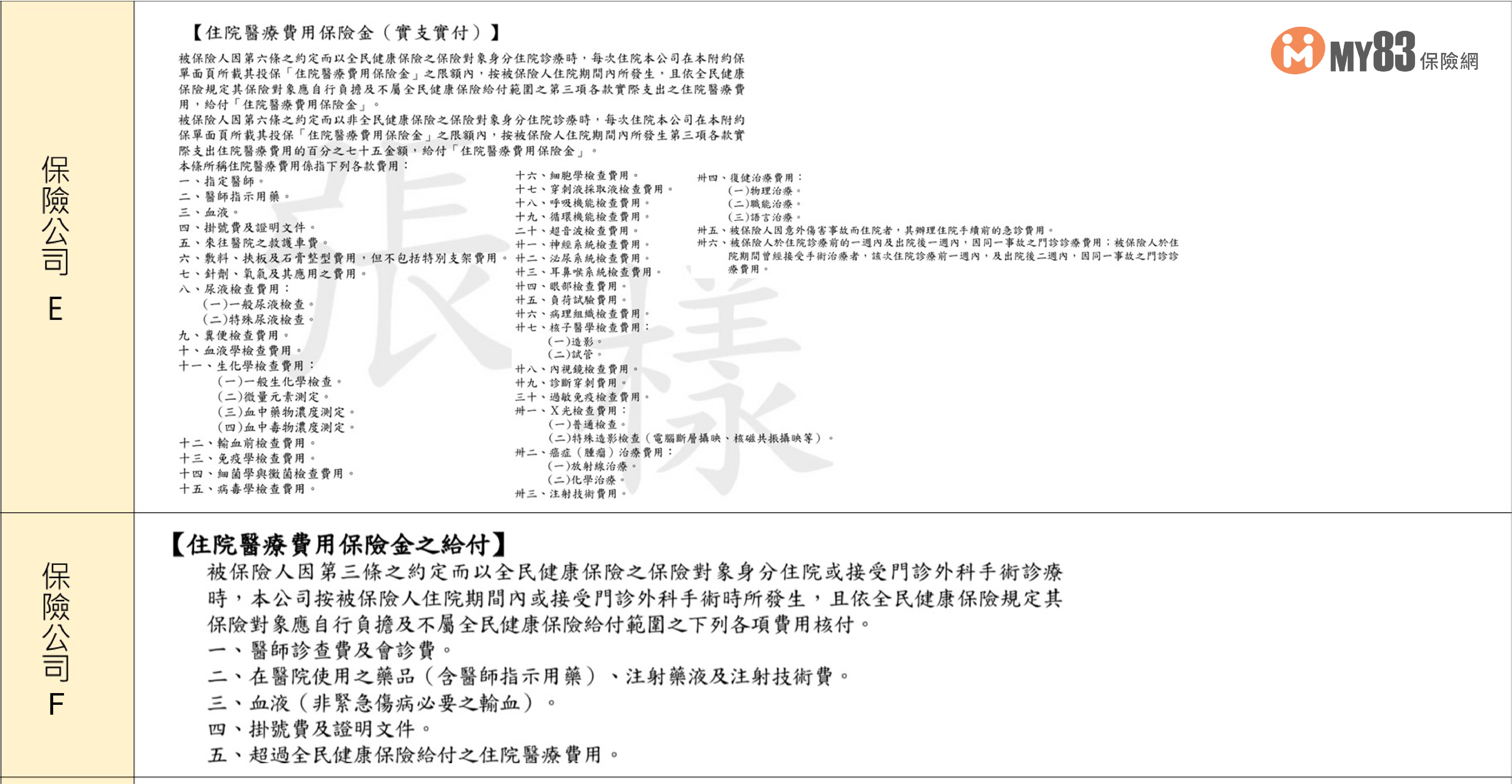 公司F:雖只列舉5項,但第5項為「超過全民健康保險給付之住院醫療費用」。