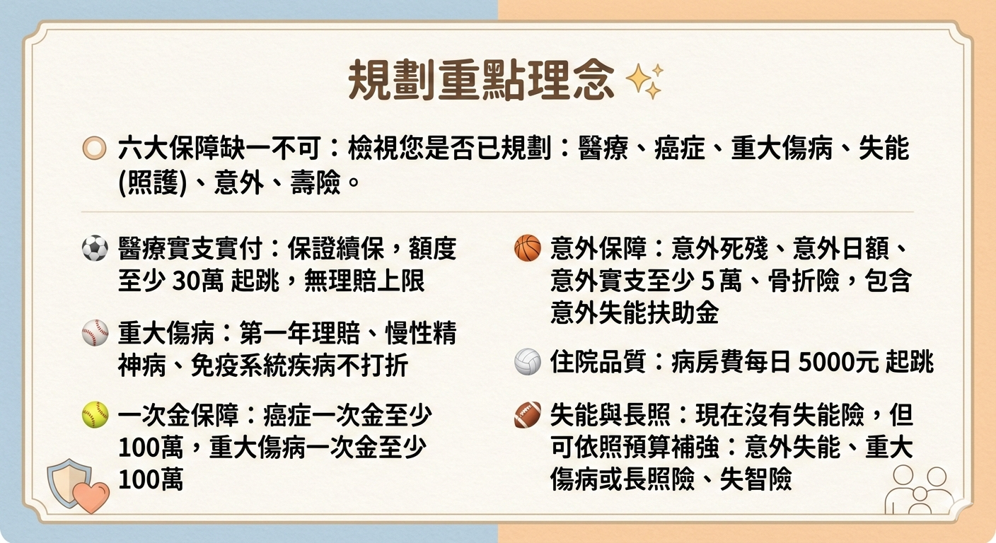 ⭕ 六大保障 : 醫療、癌症、重大傷病、失能(照護)、意外、壽險。